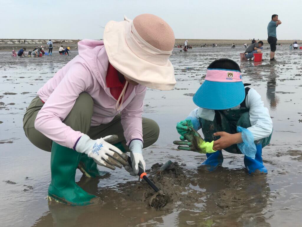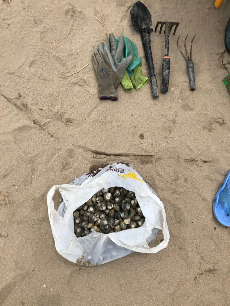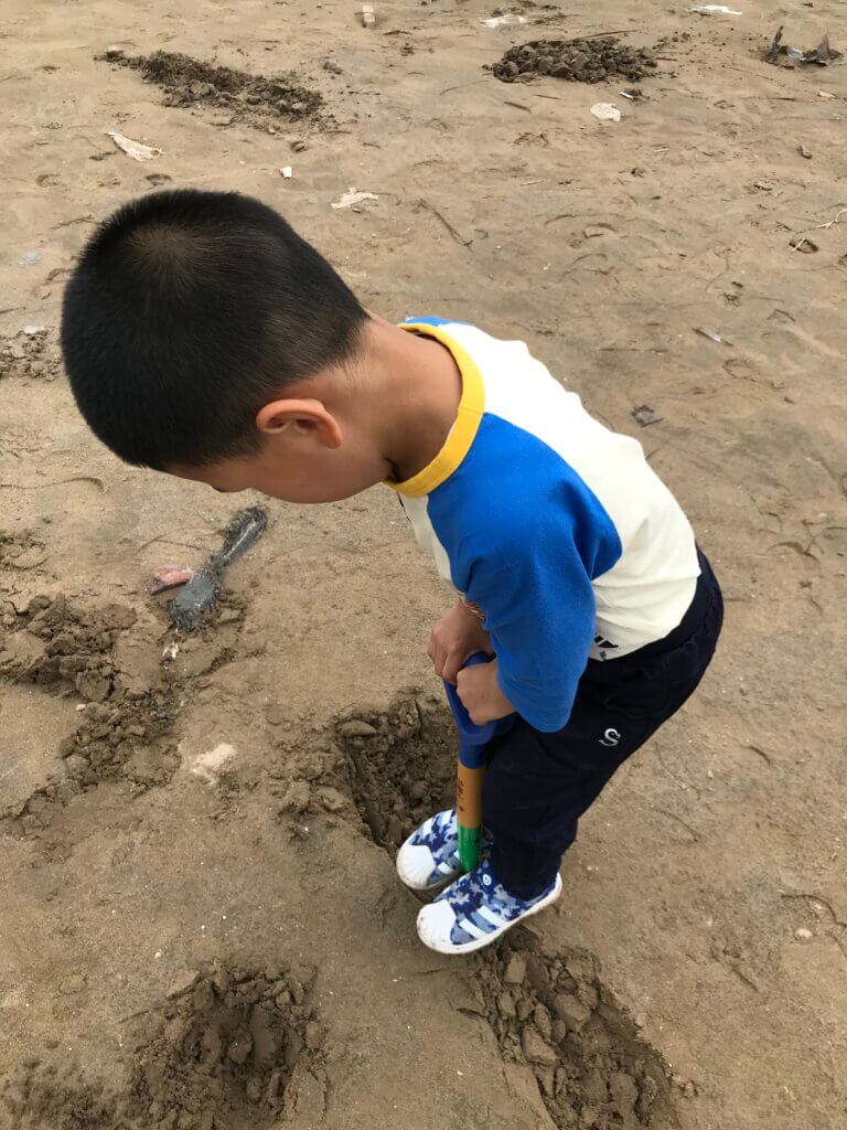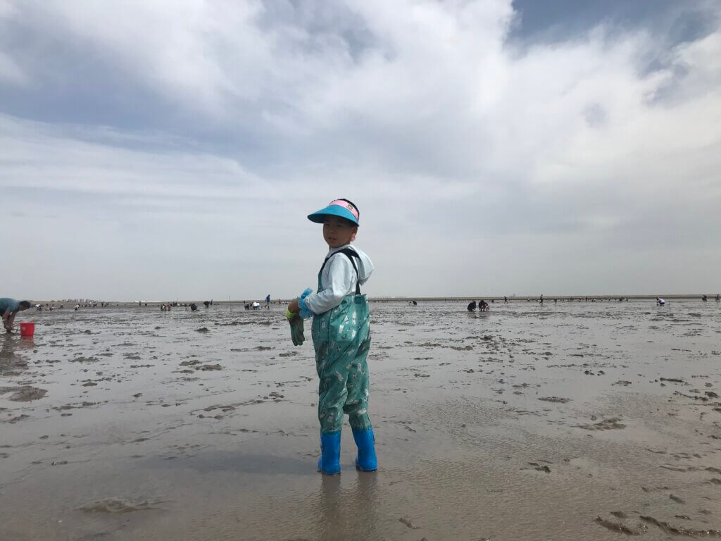 说是沙滩,其实是泥滩,海水一点点褪去,人们一点点前进,一边走一边挖。蛤蜊大约藏在泥水下三五厘米的样子,需要用小耙子和手配合。宝蛋儿的水裤起到了很好的保护作用,但手套不可避免的粘上了泥水。越往里走,泥水越松软,停留稍久一些,雨鞋就会陷入泥中,需要用手助力才能拔出。